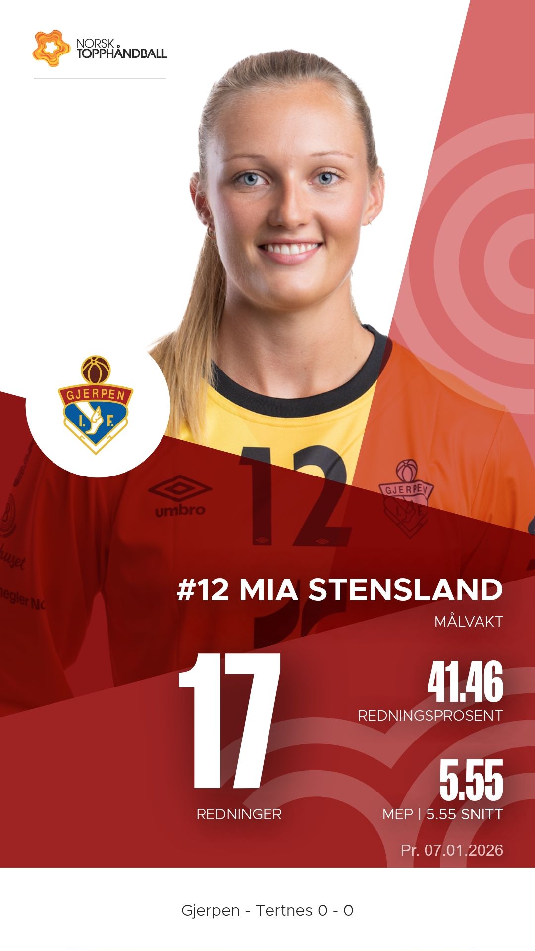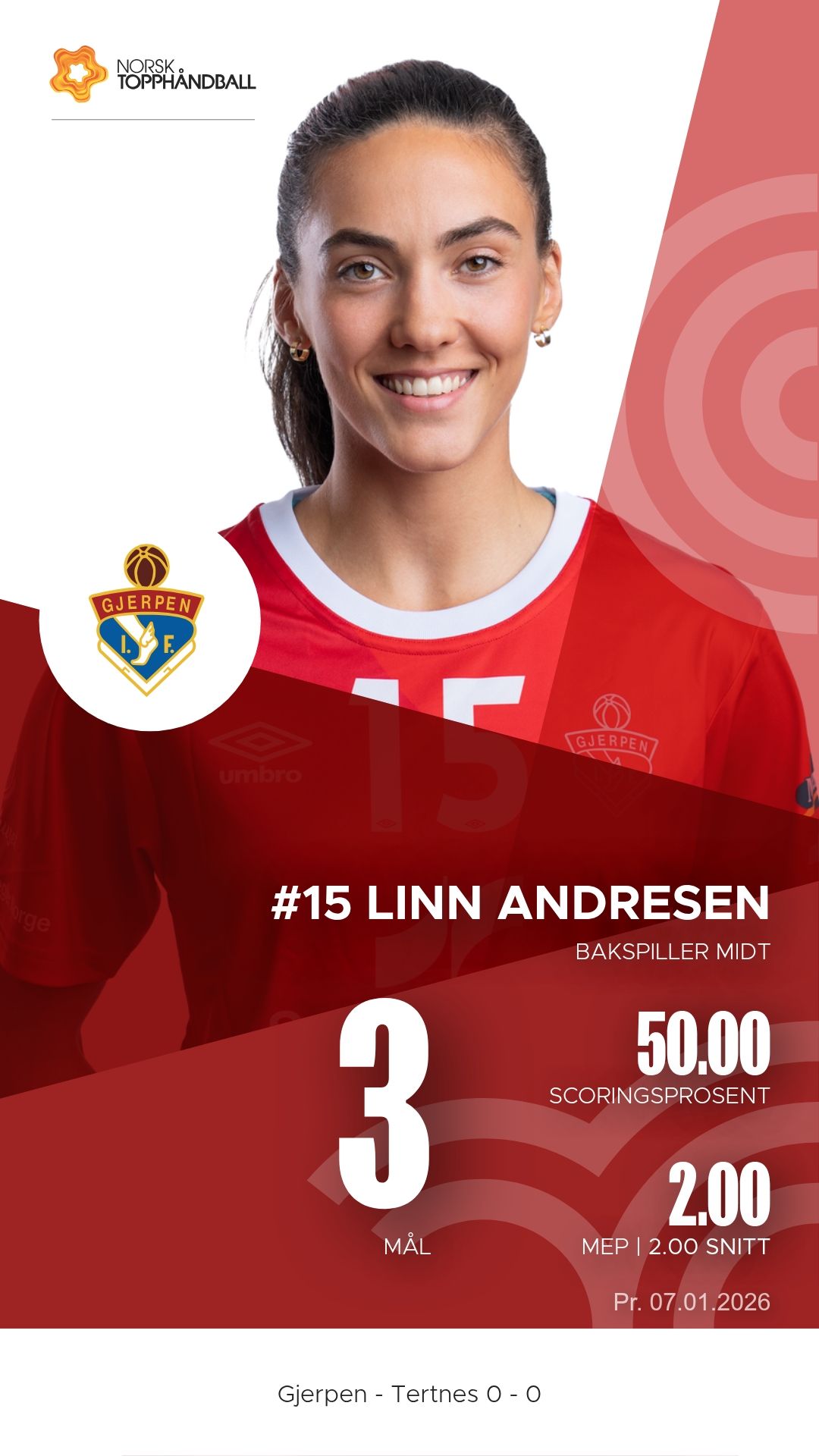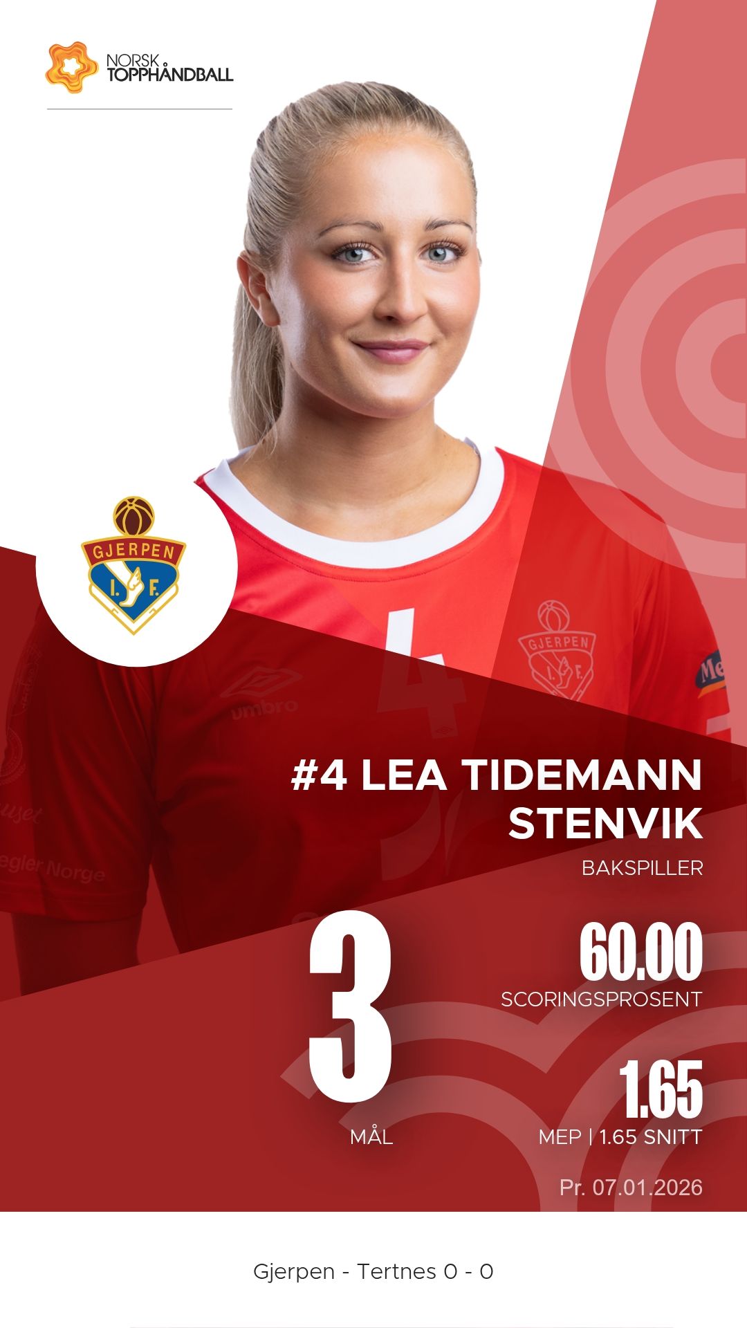 Gjerpen tok imot Tertnes Elite til kamp i REMA 1000-ligaen sesongen 2025–2026 i Skienshallen onsdag 7. januar 2026. Det ble en tett og intens duell der hjemmelaget presset gjestene hele veien, men måtte se poengene glippe til slutt. Pauseresultatet var 11–14, og sluttresultatet endte 24–26 i favør Tertnes Elite.